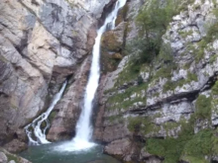 Níže po toku řeky Soča u města Kobarid lze navštívit další ze zajímavých vodopádů Kozjak. Ten se ukrývá v těsném sevření skal a cesta k němu vede pouze podél skály po dřevěném chodníčku. Dunění padající vodní masy je v téměř uzavřeném prostoru silným zážitkem.